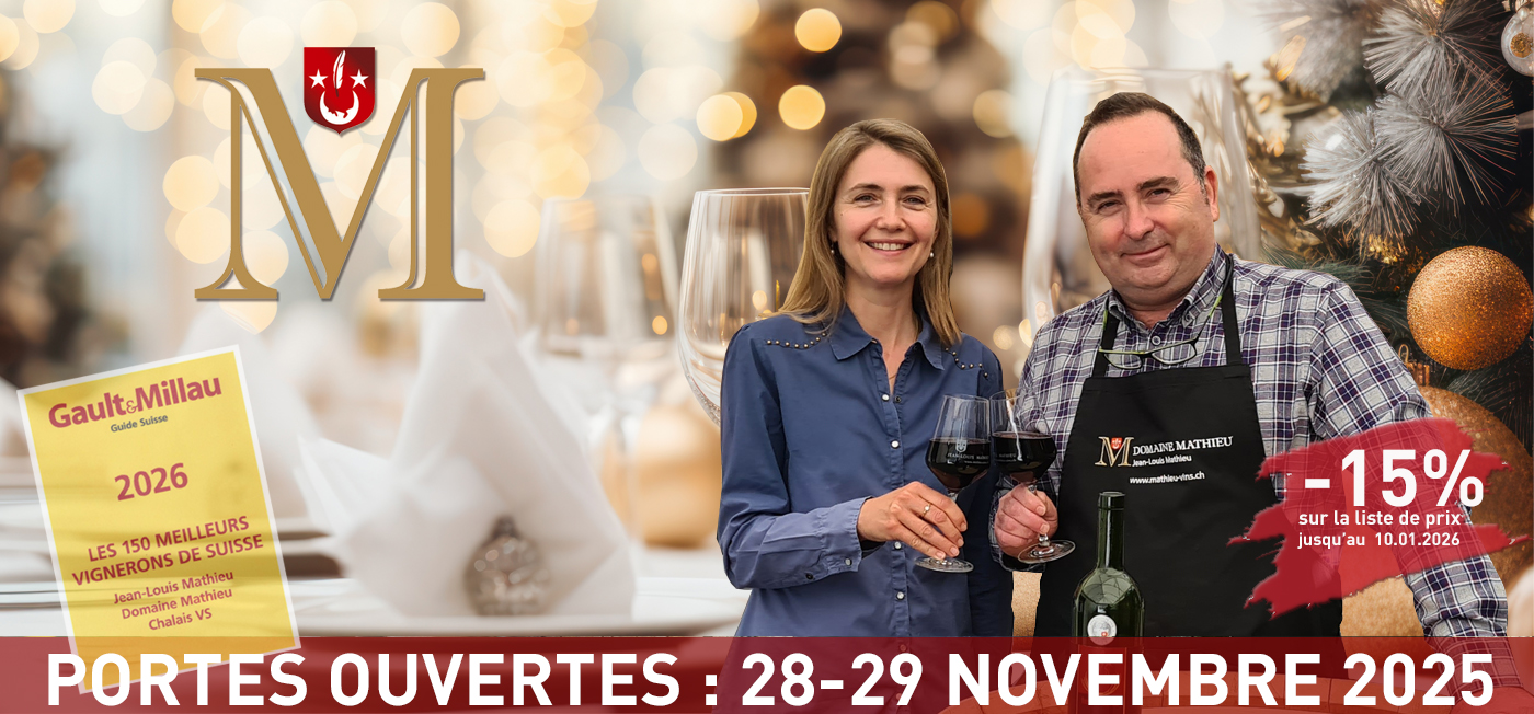 Réservez d'ores et déjà le VENDREDI 28 NOVEMBRE DE 16H à 20H ou le SAMEDI 29 NOVEMBRE DE 10H30 à 18H pour notre traditionnelle dégustation / vente de Noël dans une ambiance chaleureuse et conviviale. Bénéficiez dès ce jour d'un rabais de 15% sur notre liste de prix, offre valable jusqu'au 10 janvier 2026. Pour une dégustation ou un achat hors des portes ouvertes, merci de nous avertir de votre visite (assurez-vous de notre présence par téléphone).